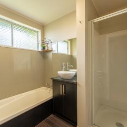 Inside, the layout works exceptionally well with three good-sized bedrooms, each with built-in wardrobes, a well-presented bathroom featuring both a bath and separate shower, and a separate toilet for everyday convenience. The kitchen has a modern feel with generous pantry storage and connects easily to the open plan dining and living area, creating a warm and practical central hub of the home.