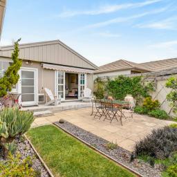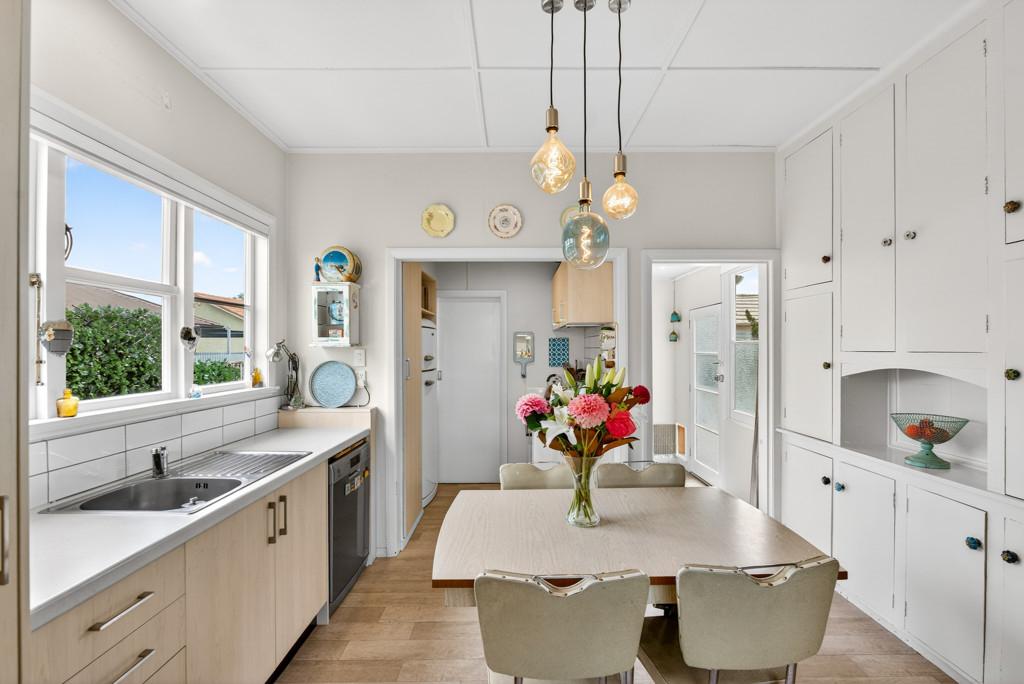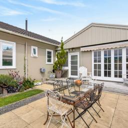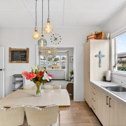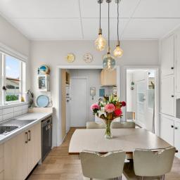 Inside, light-filled spaces flow effortlessly, blending classic features with contemporary living. The modern kitchen has been carefully renovated to retain the home's character, featuring smart finishes and practical design at its heart. It connects seamlessly to the open-plan dining area and comfortable lounge, which features a charming bay window, a heat pump, and a cosy gas fire - perfect for warmth and relaxation year-round.