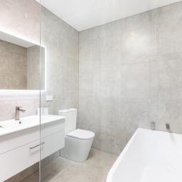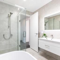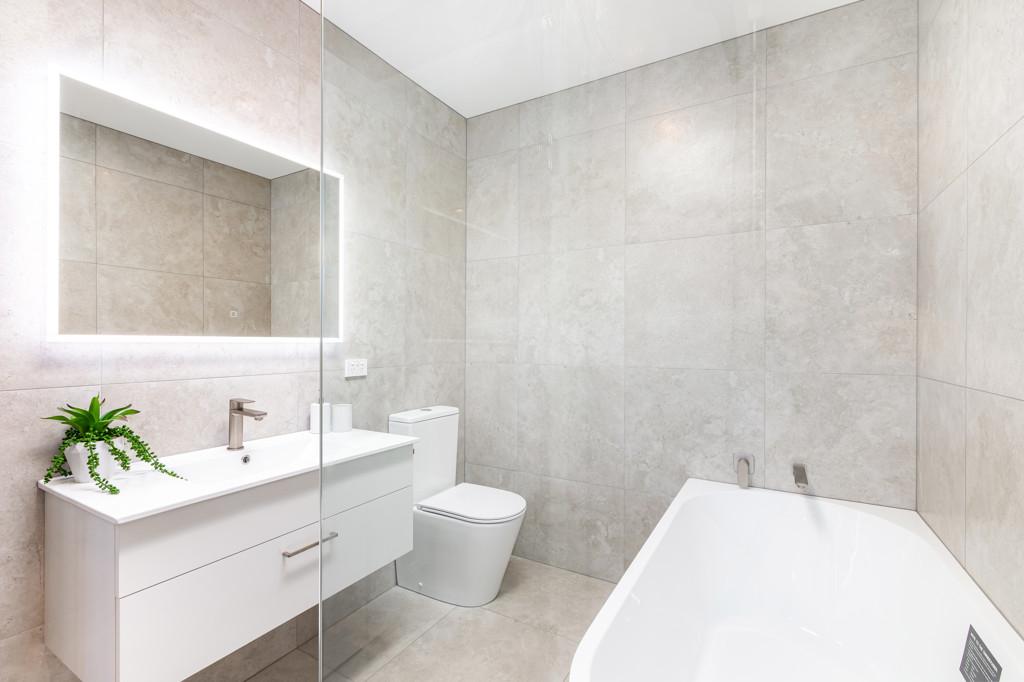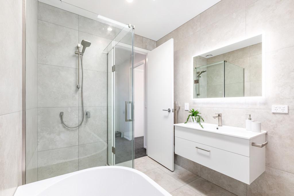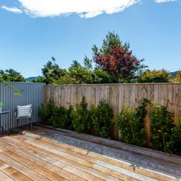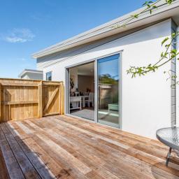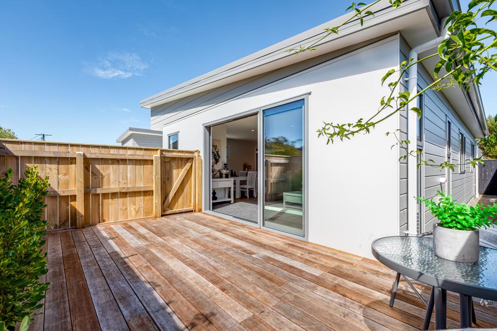 A fully tiled bathroom includes both a separate bath and a shower, delivering a clean, modern finish. Large stacker doors extend the living area to a timber deck and fenced outdoor space, ideal for hosting or relaxing with minimal upkeep required.