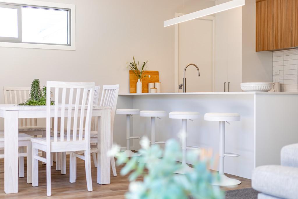 At the centre of the home, the contemporary kitchen is fitted with engineered-stone benchtops, quality appliances, and a large island that provides ample space for preparation and entertaining. The open-plan layout connects seamlessly to the living and dining areas, creating a versatile hub for everyday living.