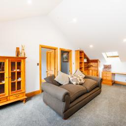 Accommodation is generous and thoughtfully arranged across two levels with five spacious bedrooms. A guest bedroom with an ensuite on the ground floor is ideal for visitors or extended family. Upstairs, the luxurious master suite enjoys its own private balcony, while two further bedrooms are complemented by an additional living space. A fifth bedroom and dedicated office create the perfect environment for growing families or those working from home.