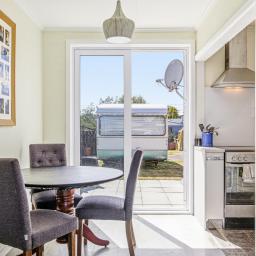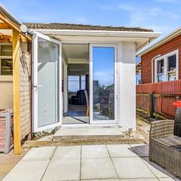 Enjoy sea views from the lounge, where a heat pump and ventilation system ensure year-round comfort. The modernised kitchen connects effortlessly with the open-plan dining area, which opens out to a covered rear patio—a sheltered and inviting space for outdoor living or entertaining.