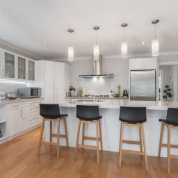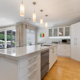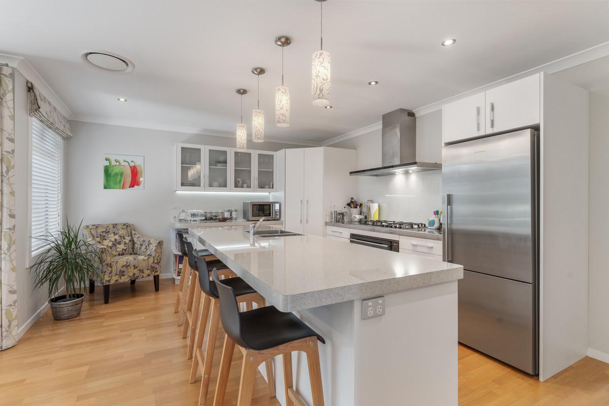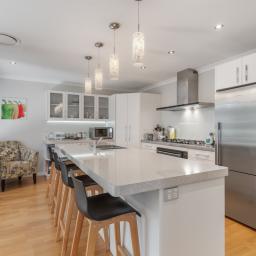 The beautifully appointed entertainer's kitchen flows seamlessly into the open plan dining and family area, with stacker doors opening onto a patio and dual pergolas to create a perfect indoor-outdoor connection.
