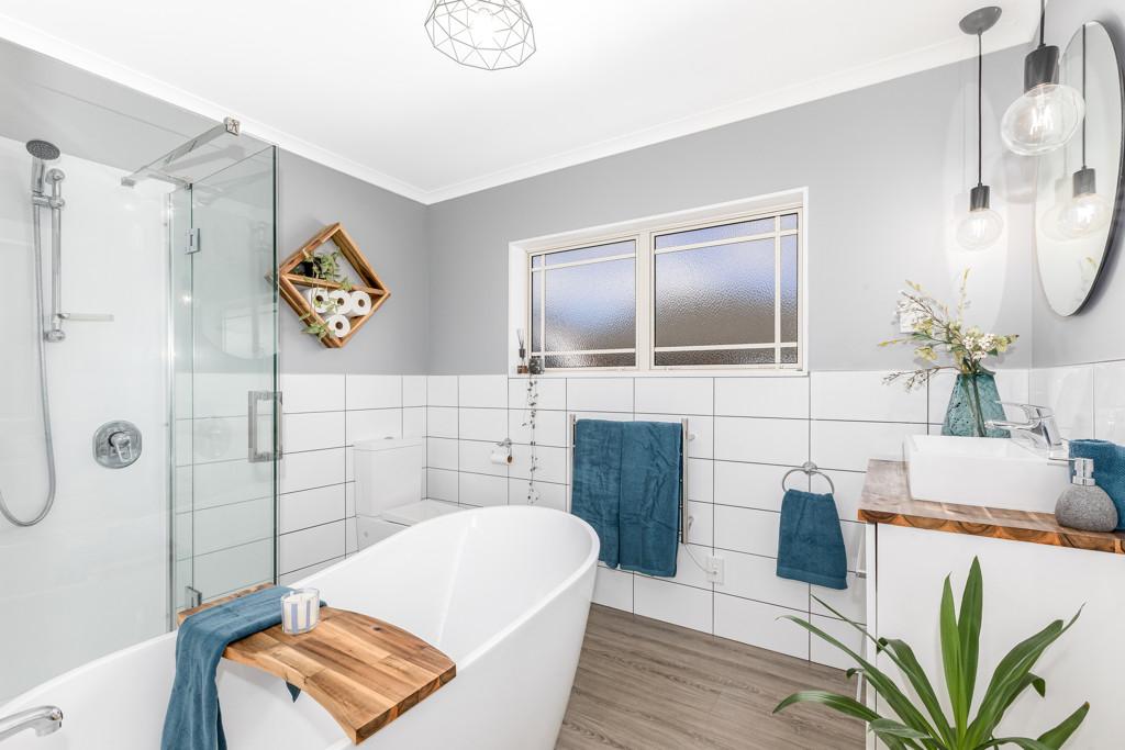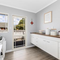 The family bathroom is beautifully presented and includes both a separate bath and shower. A dedicated laundry with extensive storage further enhances the home's practicality.