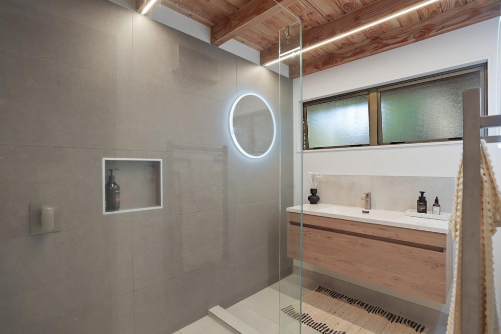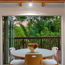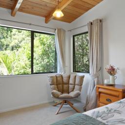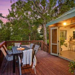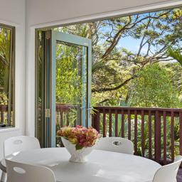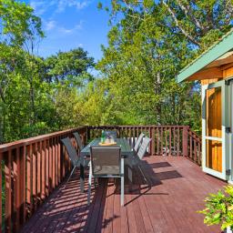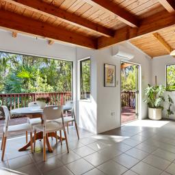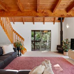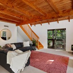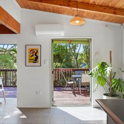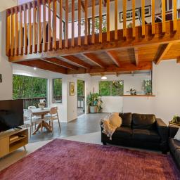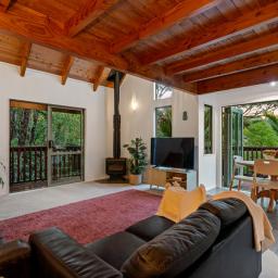 The main living area is bright, warm and welcoming, with large windows drawing in natural light and opening seamlessly to a sun-soaked deck. Bathed in sunshine, this is a space where you can relax, entertain or simply enjoy the peaceful outlook over the surrounding greenery.