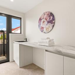 It’s bright, sunny and spacious, with an exquisite kitchen that opens to a generous living area and out to a sunny deck, perfect for easy indoor-outdoor living. The kitchen also features an extra space off to the side, ideal for additional storage and extra prep space, perfect for keeping everything organised and working efficiently.