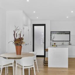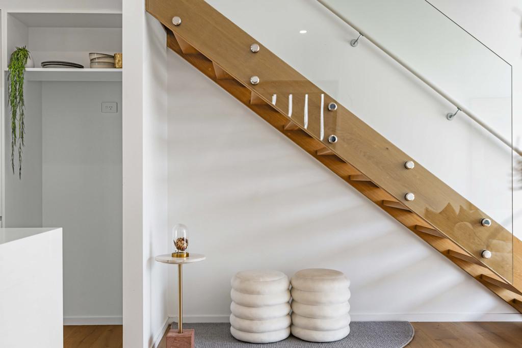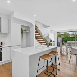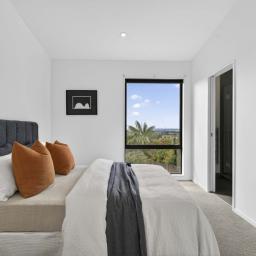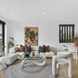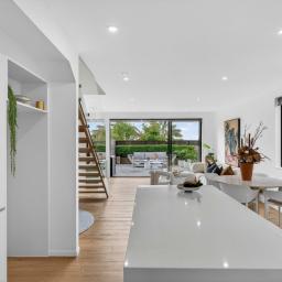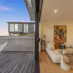 Living moves easily from inside to outside, with the first level opening onto a generous deck that extends the home's footprint. It changes how the home is used, as much for everyday living as it is for hosting. Inside, 2.7-metre ceilings carry a sense of scale, while oak flooring, floor-to-ceiling windows, and a kitchen anchored by a stone island bench with Fisher & Paykel appliances keep things simple and considered.