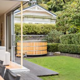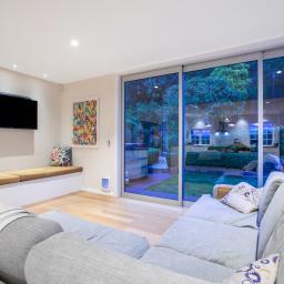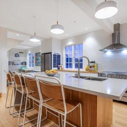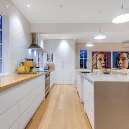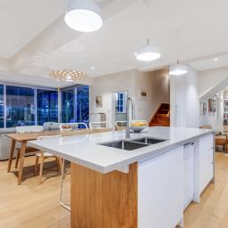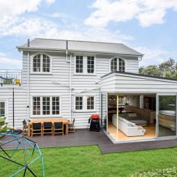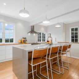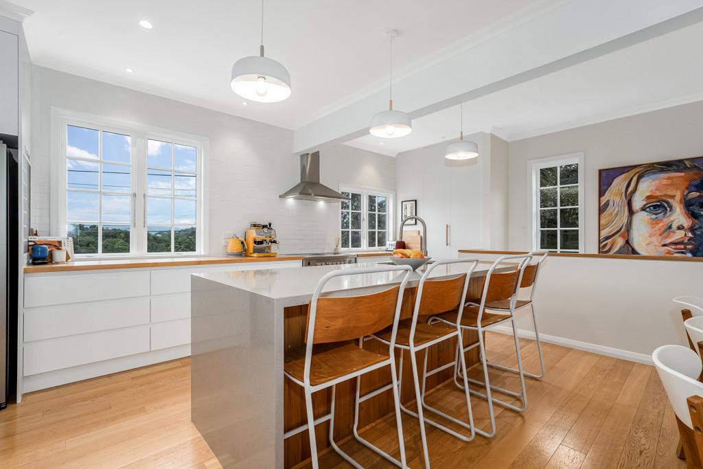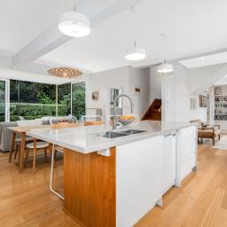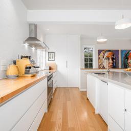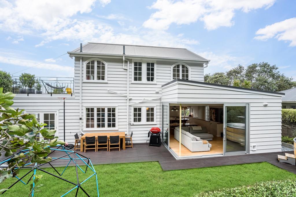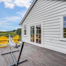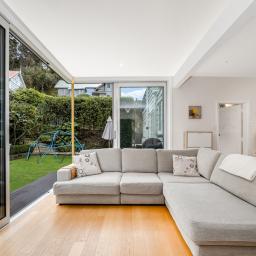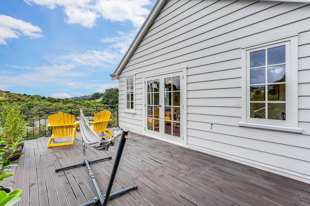 It is configured with an expansive light filled open plan kitchen and living on the main (middle) level, with what could easily be a semi- separate apartment for extended family or a teenagers zone downstairs. The main living has been extended with a floor to ceiling glass 'wall' opening to a large deck and lawn area, perfect for alfresco dining and summer barbecues, surrounded by a tranquil, well-established garden that hosts native birds. From here there is a garden path leading up to an artist's studio or home office with views to the green town belt and across to the Orongorongo ranges.