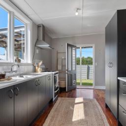 Downstairs kitchen accesses rear entrance with covered patio enjoying morning sun. The 613sqm flat section is fully fenced and boasts a large tree for summer shade. Super size double garaging with workshop space and great off street parking. Lots of scope to further develop the grounds.