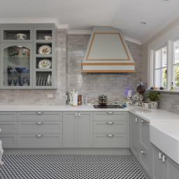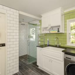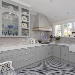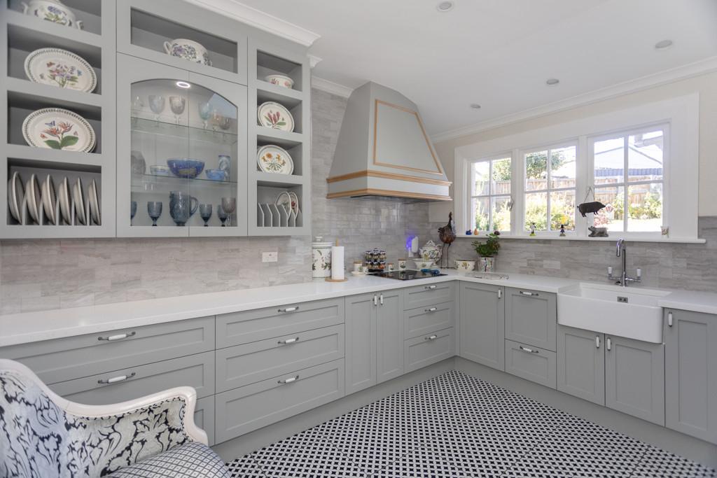A generous pantry with bifold doors and pull-out drawers ensures excellent storage, while under-cabinet lighting and a lighted glass display cabinet add both style and functionality.