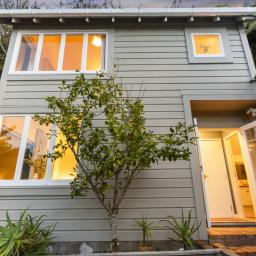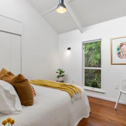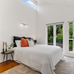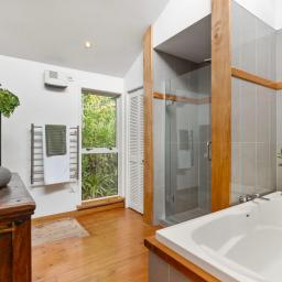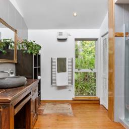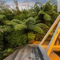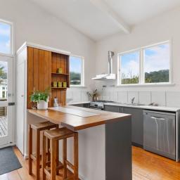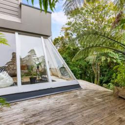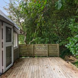 The three bedroom main home offers relaxed open plan living, with a high-stud kitchen and living area flowing to a sunny balcony. Multiple decks extend out through the greenery, creating perfect spots for morning coffee, summer dinners, or simply watching the tui and kereru drift through the trees.
