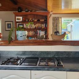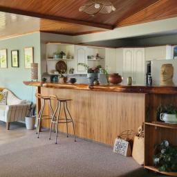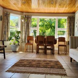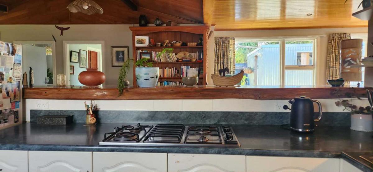 The open-plan living area features a charming tongue-and-groove ceiling, with new carpet and tiled flooring throughout. Three distinct zones create space for dining, fireside relaxing, or hosting from the spacious kitchen, while guests gather around the stunning macrocarpa benchtop.
