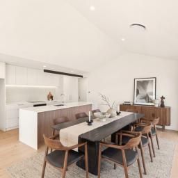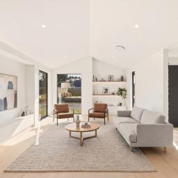 Step inside and you're greeted by a striking stone feature wall that flows through the entrance, enhanced by feature pin lighting that sets a warm and inviting tone. The light-filled, open-plan living area is highlighted by a statement scissor truss ceiling and abundant natural light. Built-in floating shelving and custom cabinetry with LED lighting provide both functionality and a sleek, contemporary finish, while layered pin and LED lighting throughout creates a welcoming ambience.