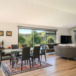 The spacious main living/ dining has sarked ceilings and sliders lead out to decked (north facing) entertaining areas.