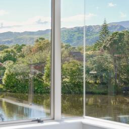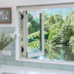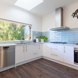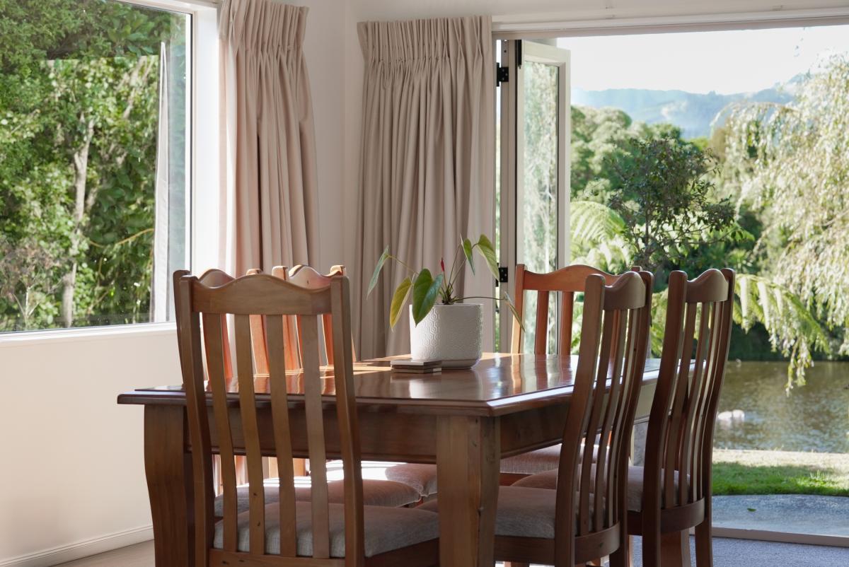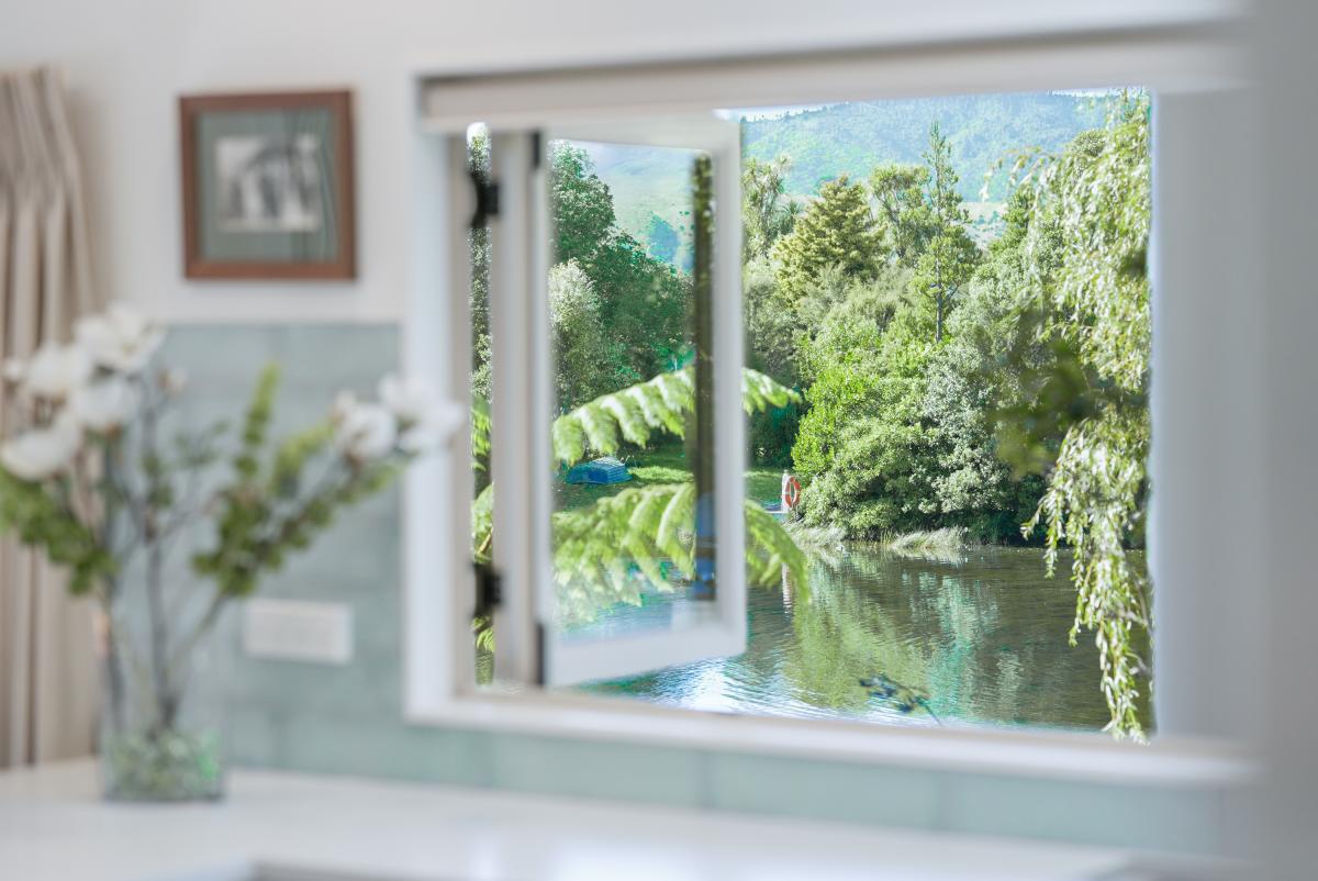 The kitchen forms the centre of everyday living, finished in crisp white cabinetry with a distinctive turquoise tile splashback and generous bench space. Positioned to enjoy views across the garden and toward the lake, it offers both practicality and atmosphere.