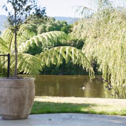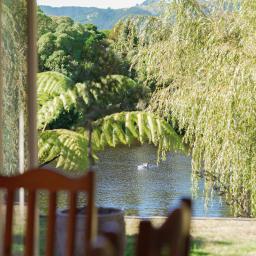 One bedroom opens to a balcony overlooking the lake, offering a quiet moment above the garden.