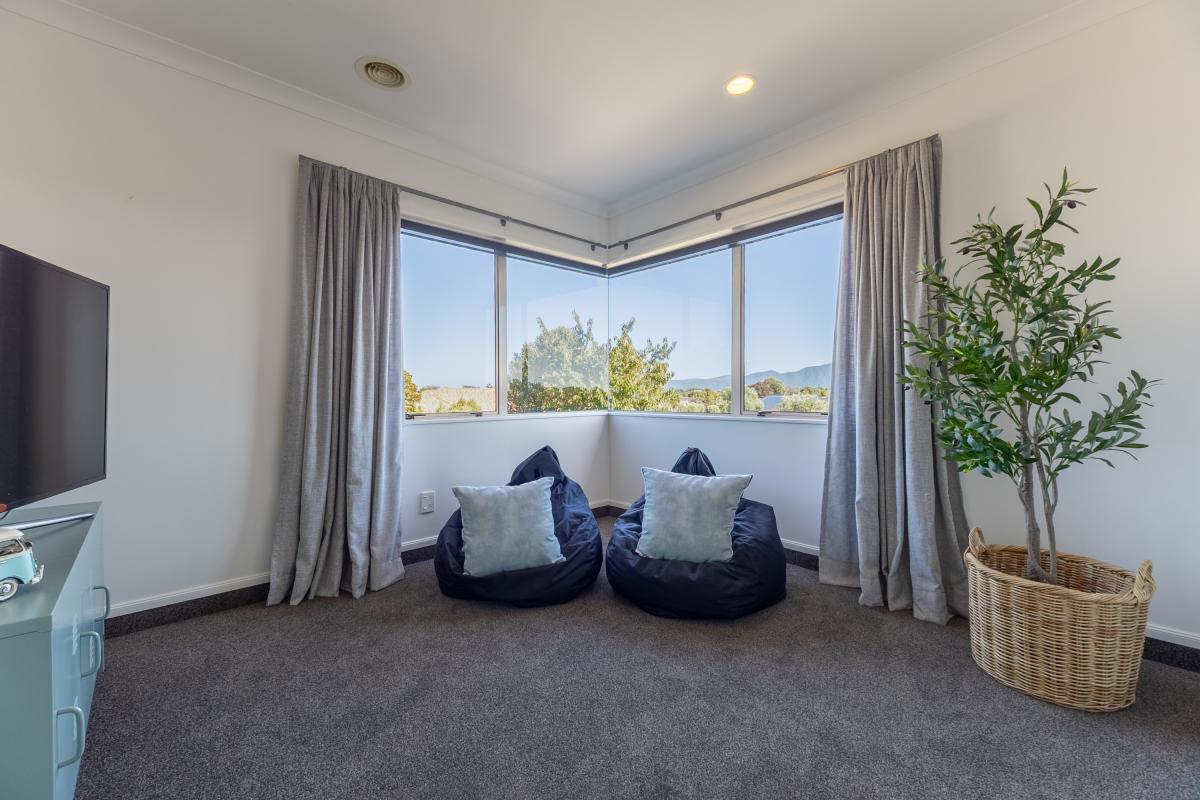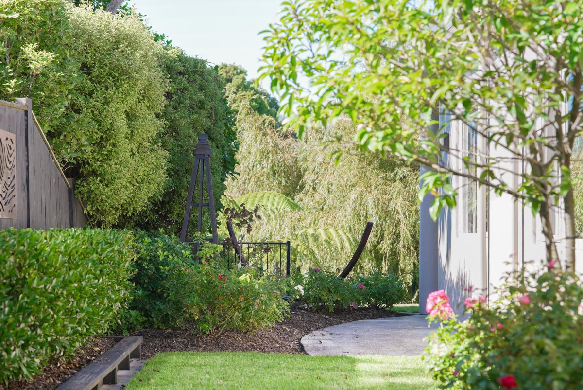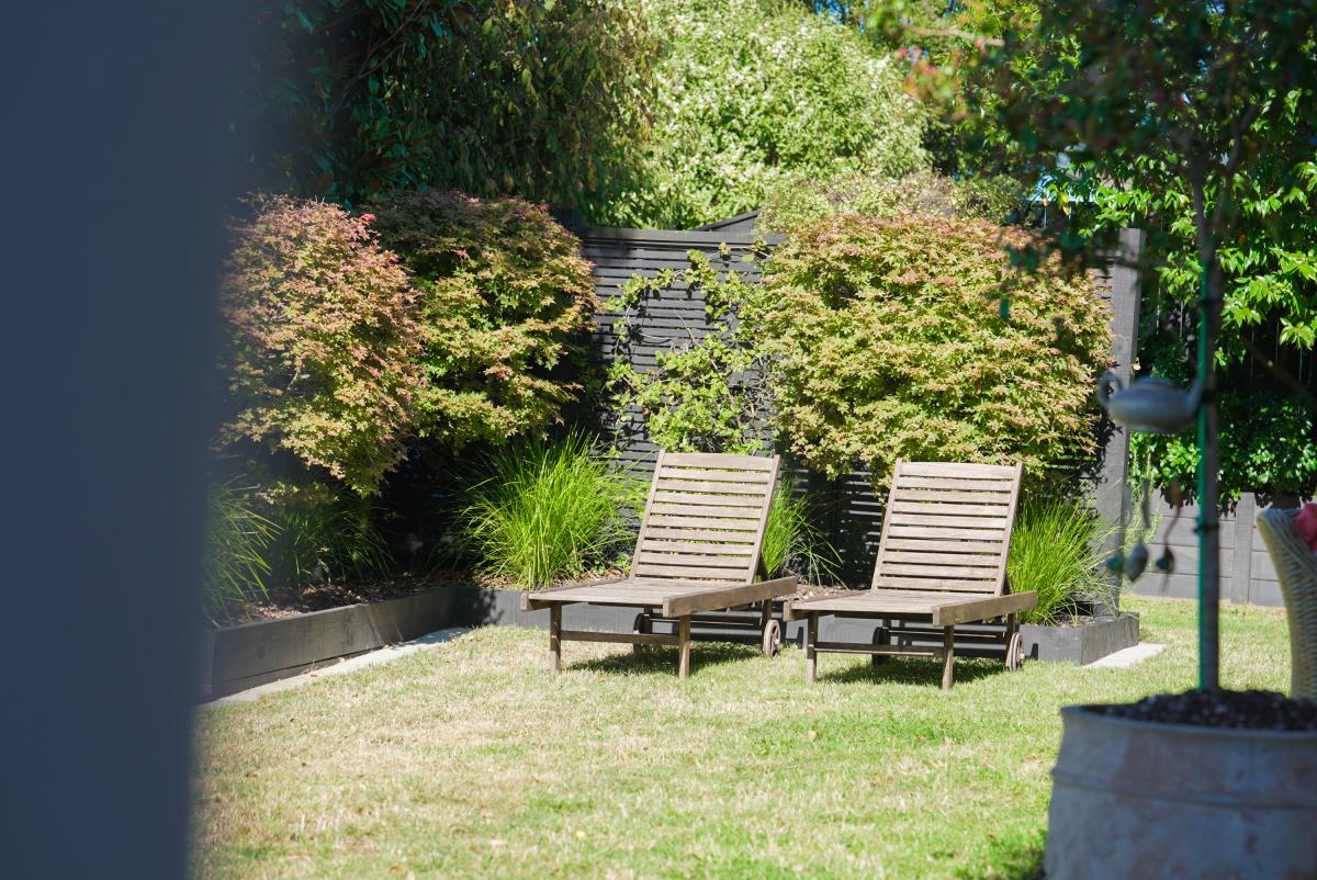 Outside, lawn and established plantings surround the home, with a sheltered patio beneath the balcony creating a calm place to pause and enjoy the outlook.