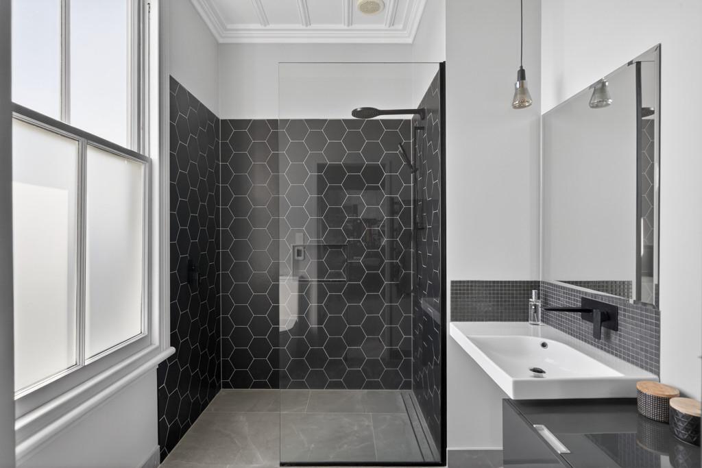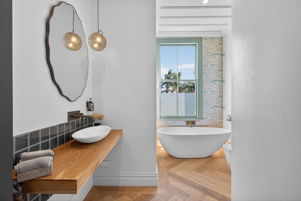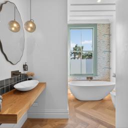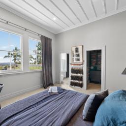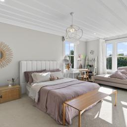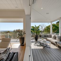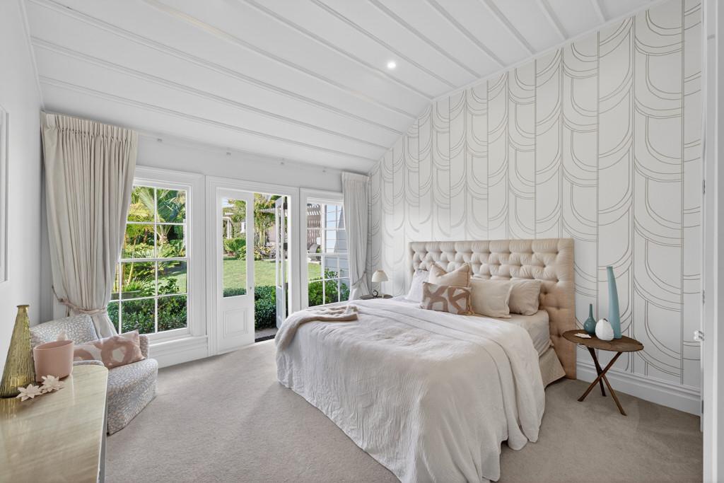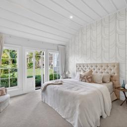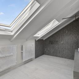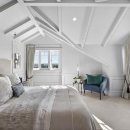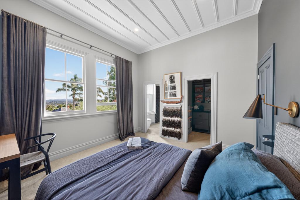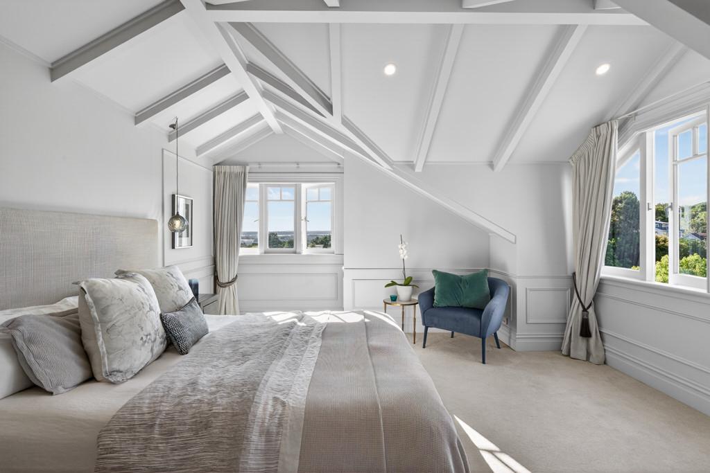 Accommodation is generous and thoughtfully arranged. On the main level, a double bedroom is accompanied by a further spacious bedroom with ensuite, alongside a beautifully appointed family bathroom and separate laundry. Above, the master suite offers a true retreat beneath vaulted ceilings, complete with a dressing room and a striking tiled ensuite. The outlook from this level is exceptional.