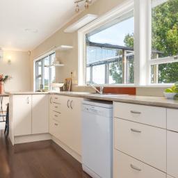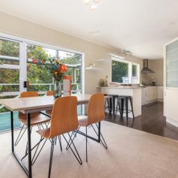 • Open-plan kitchen and dining flowing to a small deck with an outlook over the rear lawn and garden.
