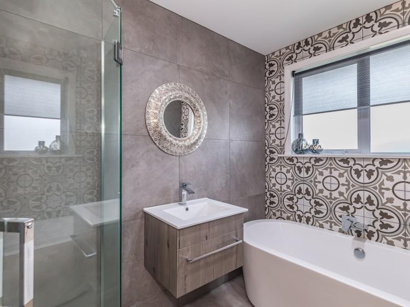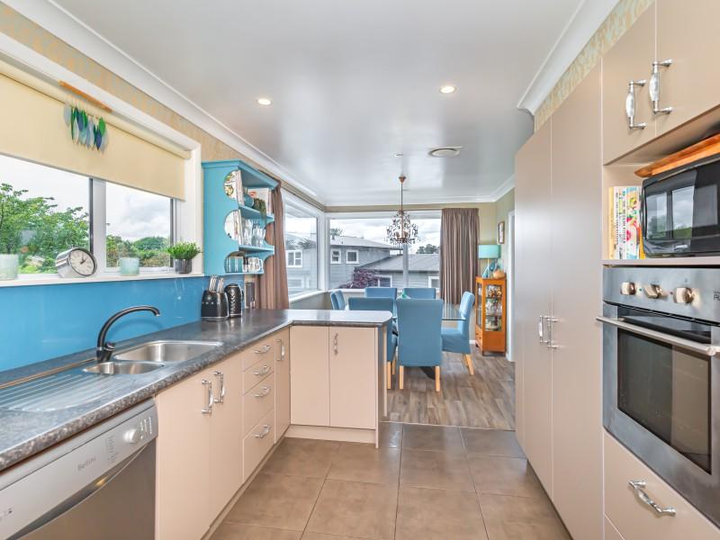 The living spaces flow effortlessly from lounge to dining and kitchen, with large picture windows flooding the home with natural light and framing the generous 964m2 section, offering plenty of space for children and pets to enjoy.